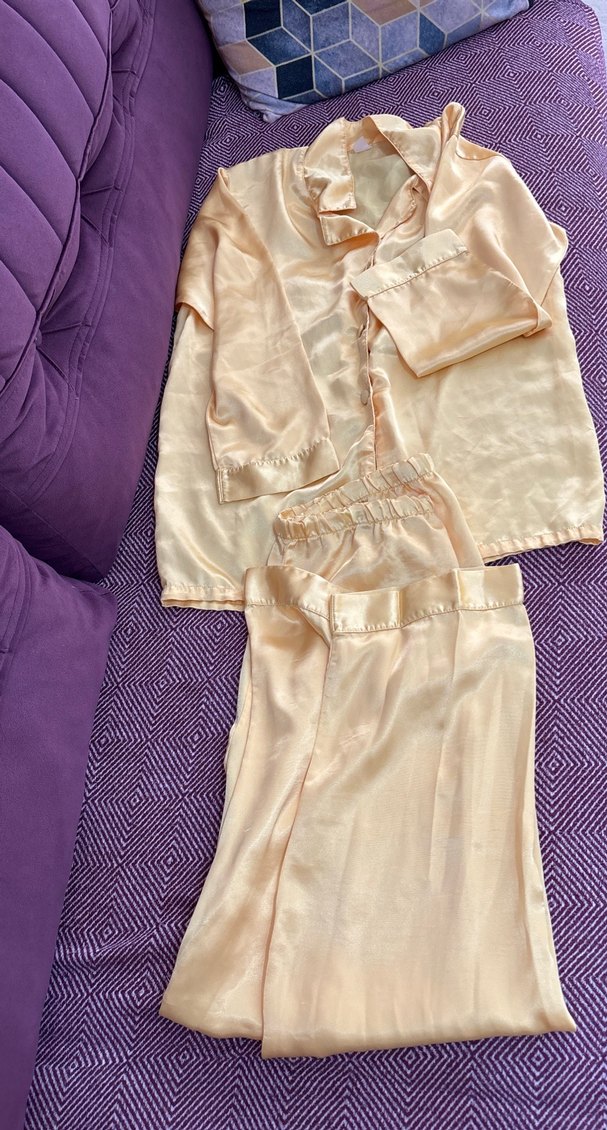 Vintage tarzda, parlak bej kumaştan yapılmış, uzun kollu ve normal kesim kadın pijama takımı, midi boyda rahat bir tasarıma sahiptir.en alttaki düğmesi düşmüş sadece .