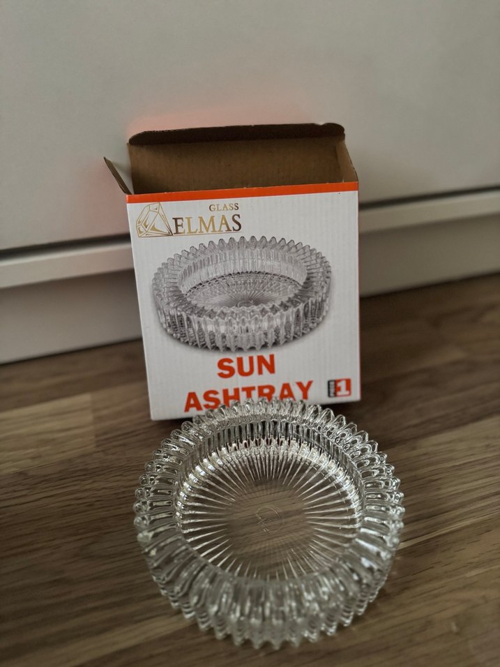 Parlak, bej renkli, desenli vintage tarzda cam küllük. Elmas markalı ve "Sun Ashtray" etiketi bulunmaktadır. ☀️