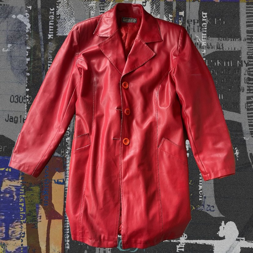 Vintage parlak kırmızı deri ceket. Notlu yaka, uzun kol ve midi boy ile sokak modasına uygun günlük kullanım için ideal.