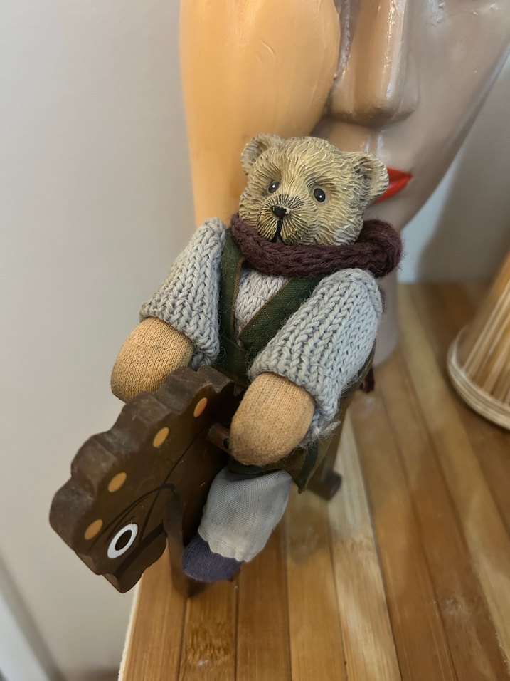 Kahverengi peluş ayıcık, gri örme kazak ve koyu atkı takıyor, elinde ahşap oyuncak at var. Yumuşak dokulu ve detaylı yüz ifadesine sahip.