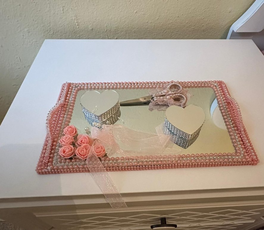 Vintage tarzda, açık pembe boncuklar ve zarif güllerle süslenmiş, kalp şeklinde aynalı tutucular ve küçük makas içeren klasik şıklıkta düğün aksesuarı.