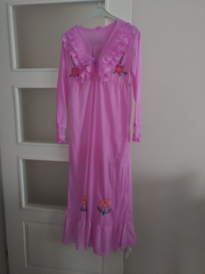 Nakışlı çiçek detayları ve uzun kollu, bol kesimiyle bohem tarzı yansıtan pembe uzun gecelik. Yaka kısmında fırfır detayları bulunur. Bir kere giyildi