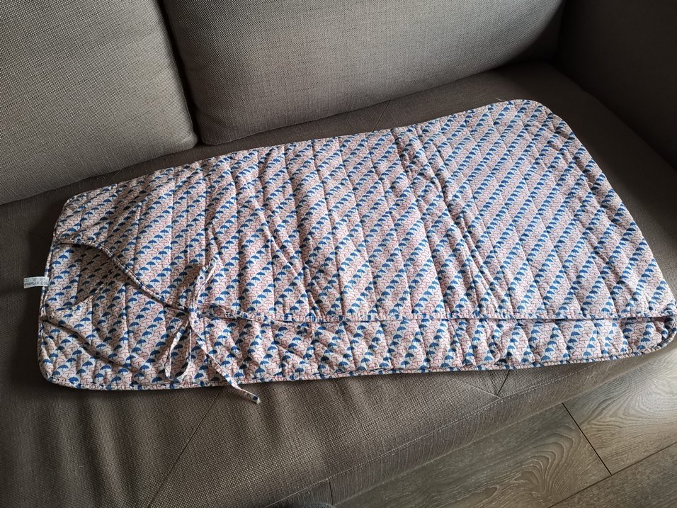 Vintage portbebe, şemsiye desenli, yüzde 100 pamuklu poplin kumaştan sıfır üründür. 42 yıl önce hediye gelmişti, hiç kullanılmadı. İçi pamuk dolgulu, rulo şeklinde katlanabilir. Ölçüleri 90x45 cm'dir.