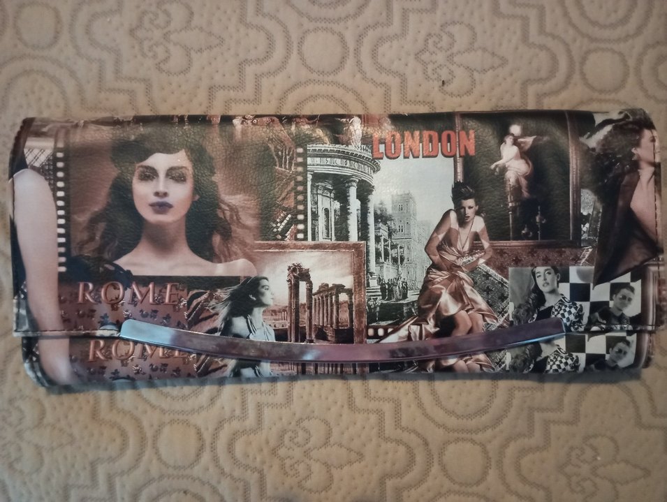 Parlak kahverengi tekstil malzemeden, baskılı ve tokalı, retro ve bohem tarzı yansıtan kadın portföy çanta. Günlük kullanıma uygun.