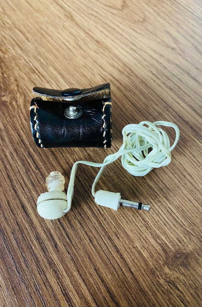 Transistörlü radyo veya kasetçalarlar için kulak içi kablolu vintage kulaklık. 1950’ler dönemine aittir. Kablo uzunluğu 90 cm. Kahverengi minik hakiki deri kılıfı 4 cm uzunluğundadır. Bu kulaklık, transistörlü radyolarla kullanım için tasarlanmıştır ve radyo, pikap, televizyon, telefon, hatıra eşyaları koleksiyoncuları için retro bir çekicilik sunar. Kablolu kulaklık, eski teknolojinin nostaljisine değer verenler için mükemmel, klasik bir dinleme deneyimi sağlar. Nostaljik ve koleksiyonluk bir üründür.