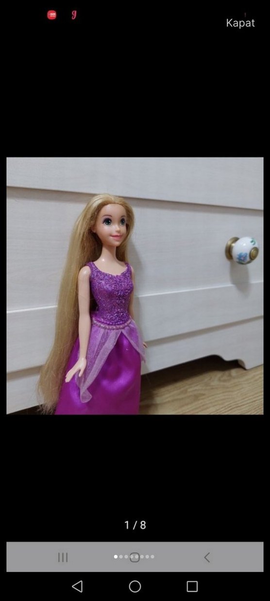 Uzun sarı saçlı bebek, dantel detaylı ve parlak mor elbise giymektedir. Eski seri nadir bulunan