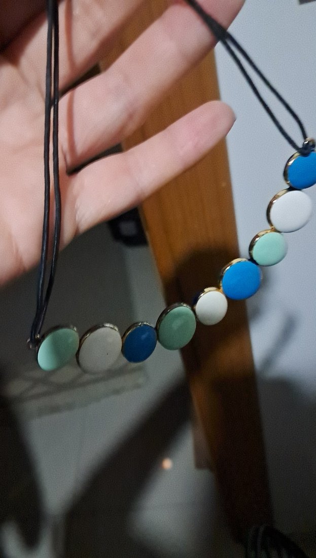 Bohem tarzda, pastel renklerde çoklu noktalı boncuklardan oluşan normal uzunlukta kolye, günlük kullanım için uygun.