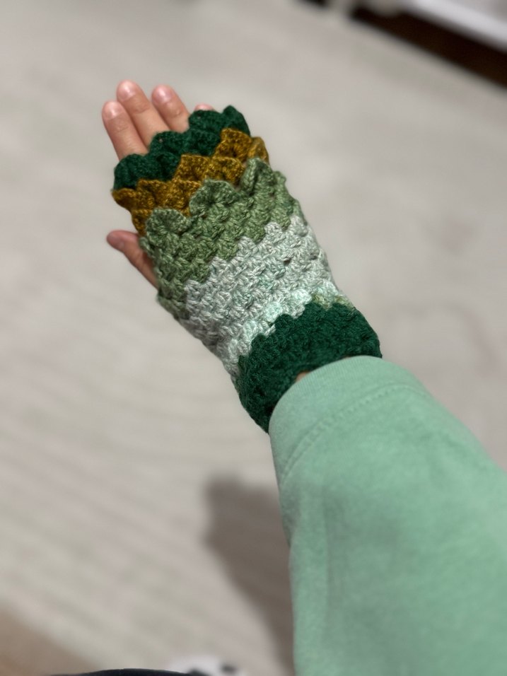 Bu örgü kadın eldiveni, hafif yeşil ve toprak tonlarında, rahat ve bohem bir stil sunar. Parmaksız tasarımıyla retro bir hava katar.