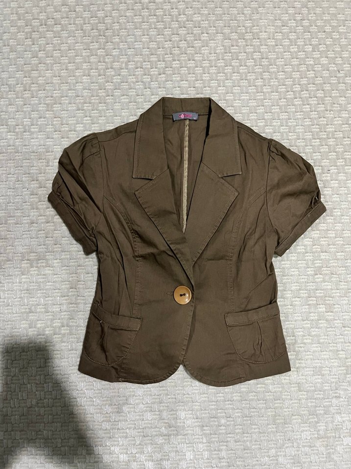 Kahverengi kadın blazer, kısa kollu, düğmeli ve kesik yaka detaylıdır. Keten kumaştan üretilmiş, normal kalıp ve midi boydadır. İş ve sokak stiline uygundur. Desensiz tasarıma sahiptir.