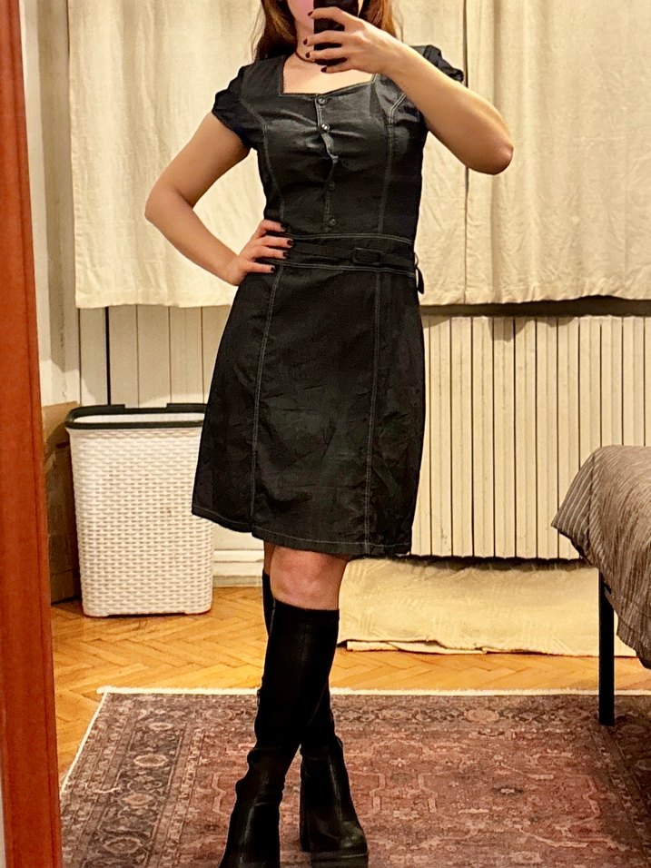 Kemerli kare yaka düğmeli kot elbise bir düğmesi eksik M beden uyumlu boy: 95 cm, omuz: 39 cm, bel: 40 cm
