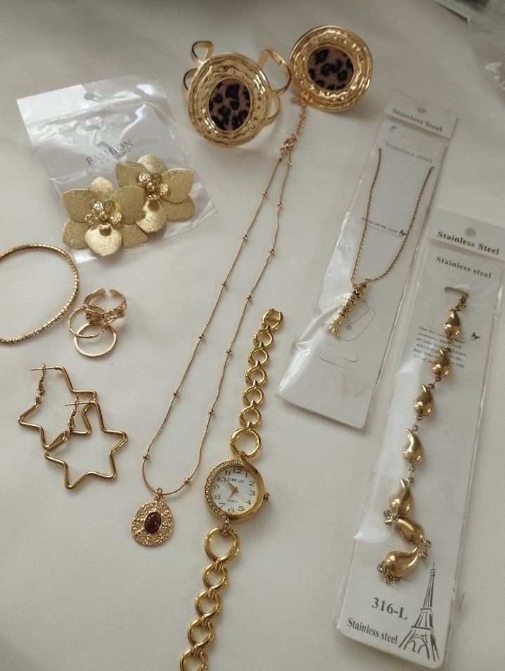 Altın renginde, zincir detaylı kadın takı seti; saat, küpe ve kolyelerden oluşur. Bohem, Paris tarzını yansıtır. ✨hepsi çeliktir gorseldekiler birebir gönderilecektir