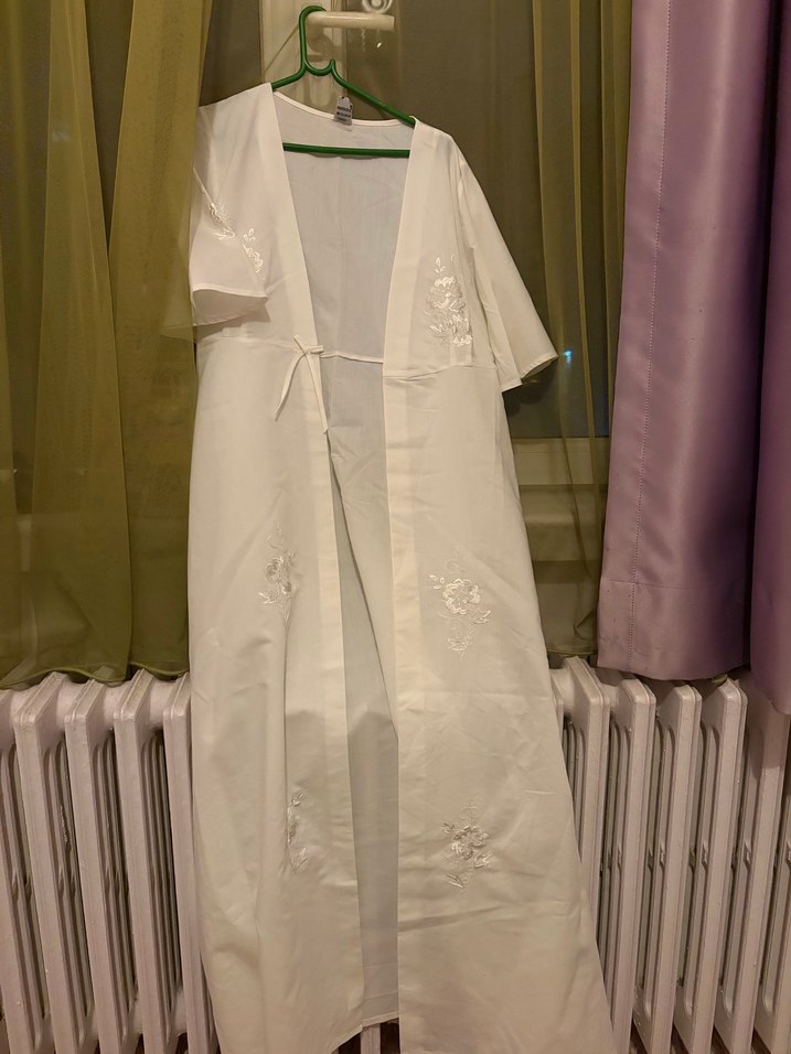 Kadınlar için beyaz renkte, uzun kollu ve bol kesim sabahlık. Minimalist ve klasik tarzda, hafif işlemeli detaylara sahip.
