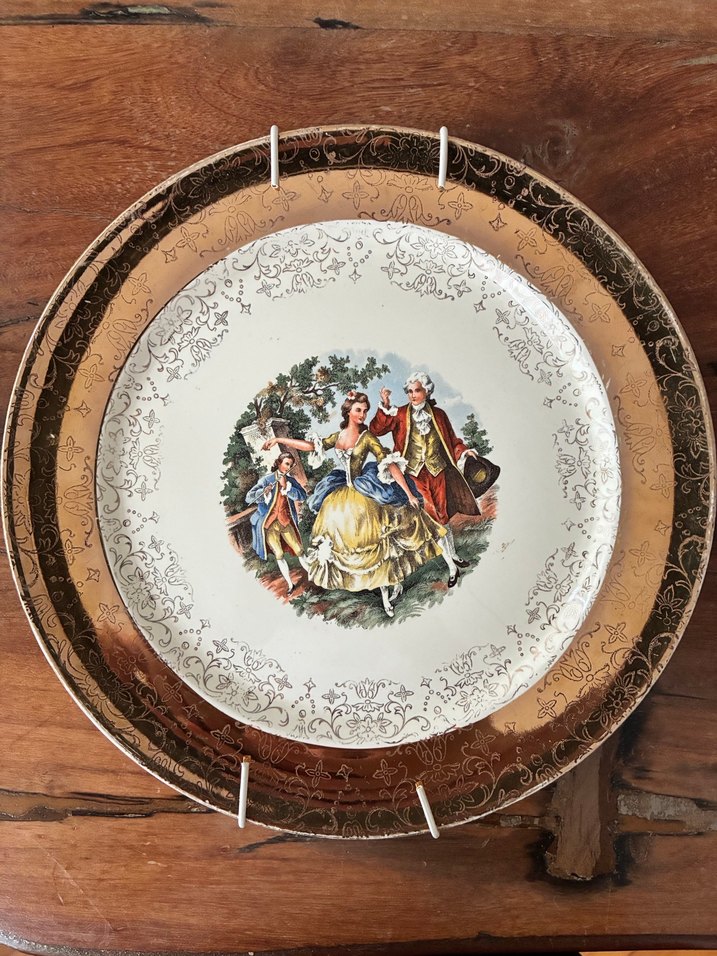 1930-50’ler ABD üretimi Salem China Company imzalı Chast-O-Gold serisinden dekoratif bir parça. Rokoko esintili aristokrat dans sahnesi, yoğun 22K altın yaldızlı bordürü ve yılların kazandırdığı doğal patinasıyla koleksiyonluk nitelikte bir parça. Çap 16 cm ağırlık 582 gr. Üretim yeri Trenton, New Jersey. ABD Bu seri özellikle 20. yüzyıl ortasında popüler olmuştur. Yaldızlarda doğal yaşa bağlı aşınmalar mevcut. Damgası net anlaşılır. Aynı deseni kullanan turistik duvar tabaklarıyla karıştırmayın