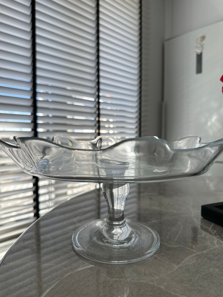 Vintage tarzda, şeffaf camdan yapılmış, ayaklı ve dalgalı kenarlı servis tabağı. ️