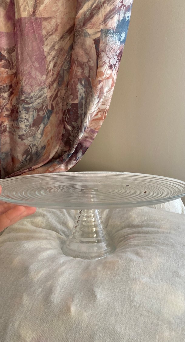 Dokulu dairesel desene sahip vintage tarzda şeffaf cam kek standı. Dayanıklı tabanı ile tatlı servisi için uygundur.