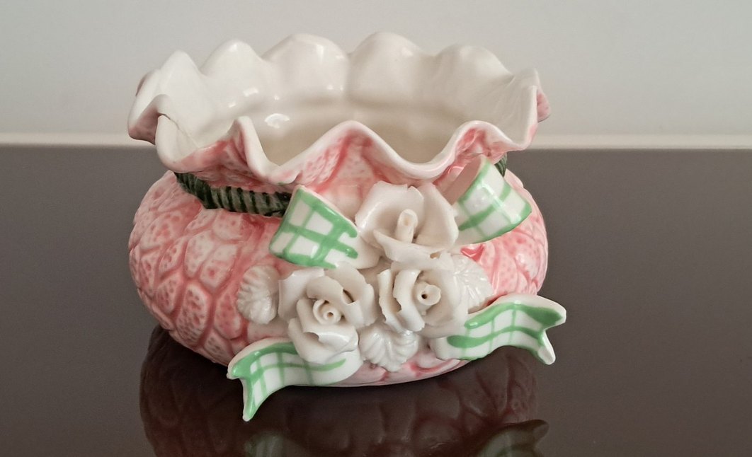 Vintage dekoratif seramik pembe yeşil tonlarda gul motifiyle işlenmiş sekerlik.