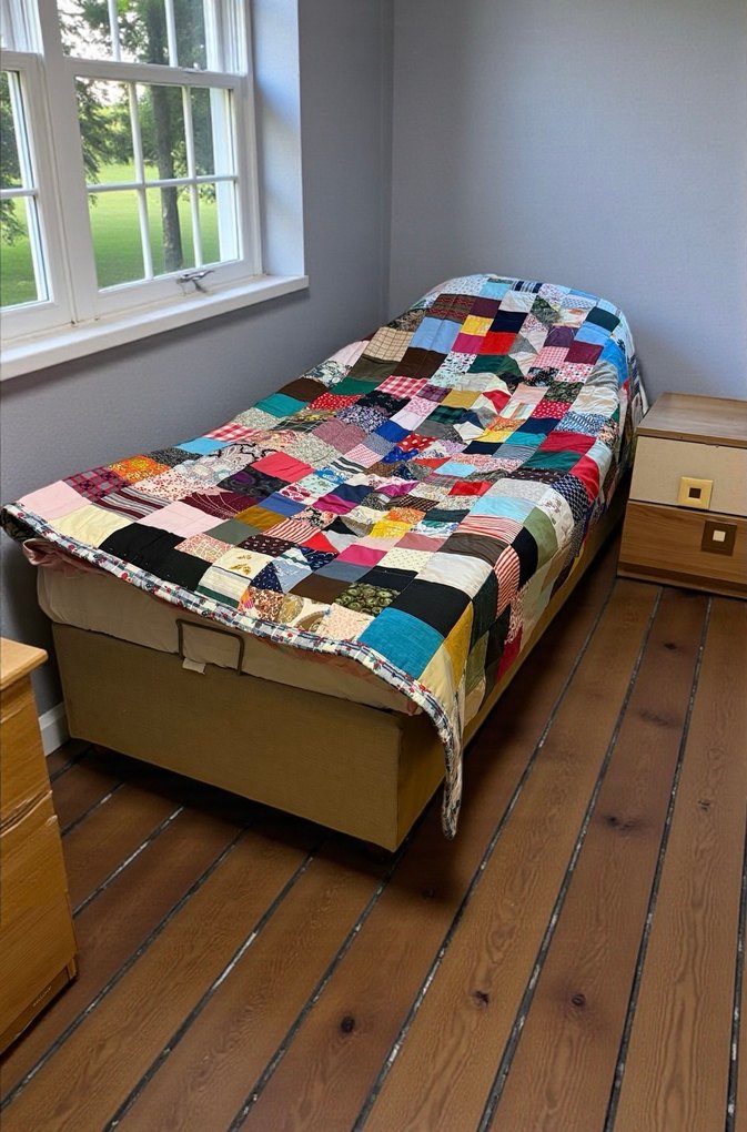 Vintage kırkyama el yapımı sandık ürünü hiç kullanılmamış .140/185 cm.Arkası kapitoneli kumaş , içi süngerli ve ağır.Temiz sorunsuz