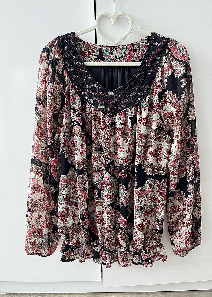 Az kullanılmış şal desenli içi astarlı vintage tarz şifon bluz. Kol kısımları astarsızdır. Etek ucu lastiklidir. Yaka kısmında dantel detayı vardır. M/L bedene uyumlu hafif dökümlü şık bir duruşu vardır.