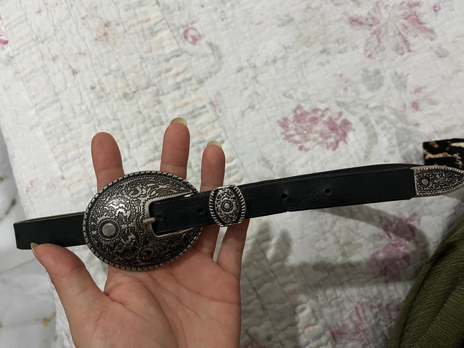 Vintage tarzda, süslü tokalı siyah deri kadın kemeri. Bohem ve retro stil için uygundur.