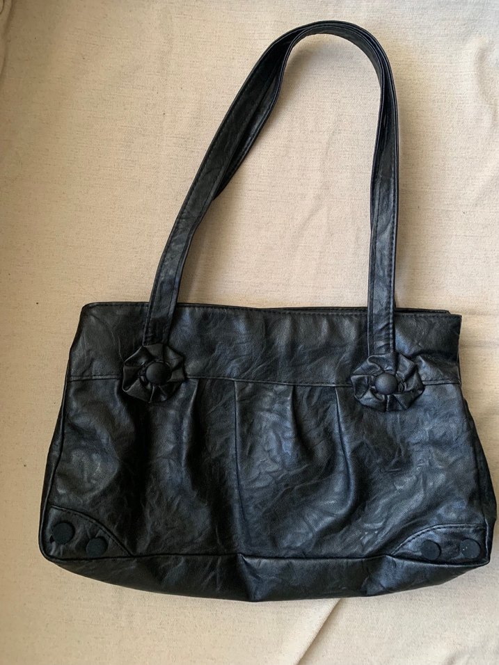 Kilitli detaylara sahip siyah deri kadın omuz çantası, koyu ve gotik tarzda, küçük bi çanta değil. ölçüleri var. içi gayet geniş.