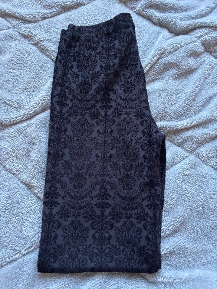 Desenli tekstil kumaştan, gotik tarzda siyah, dantel detaylı, normal boy ve dar kesim pantolon tayt. Rahat ve günlük kullanım için uygundur.