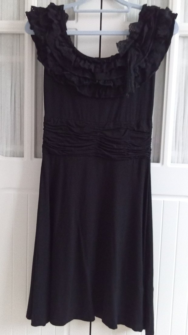 Bu siyah, fırfır detaylı tekne yaka ve vücuda oturan kesime sahiptir. Romantik akşamlar için uygundur.solma tülerme gibi sorunu yok.siyah olduğu için net çıkmadı görselde fakat yakından daha hoş elbise.boy 90 kol altı en 37 bel 31cm likralı #vintageelbise