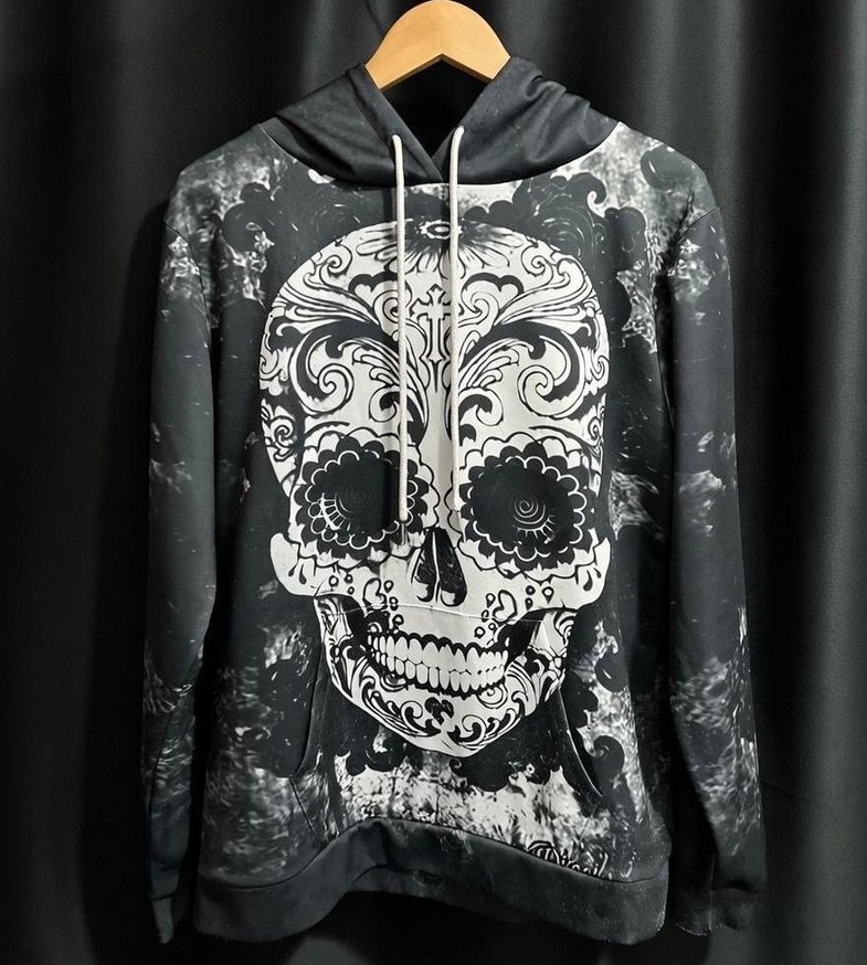 Y2K Gothic Treasure. Vintage siyah hoodie, dev ornate skull print’le (Dia de los Muertos esintili) ve drawstring yaka detaylı! 2000’ler emo/grunge enerjisi tam burada! Beden: Medium En: 52 Boy: 69 Durum: Temiz, vintage ürün