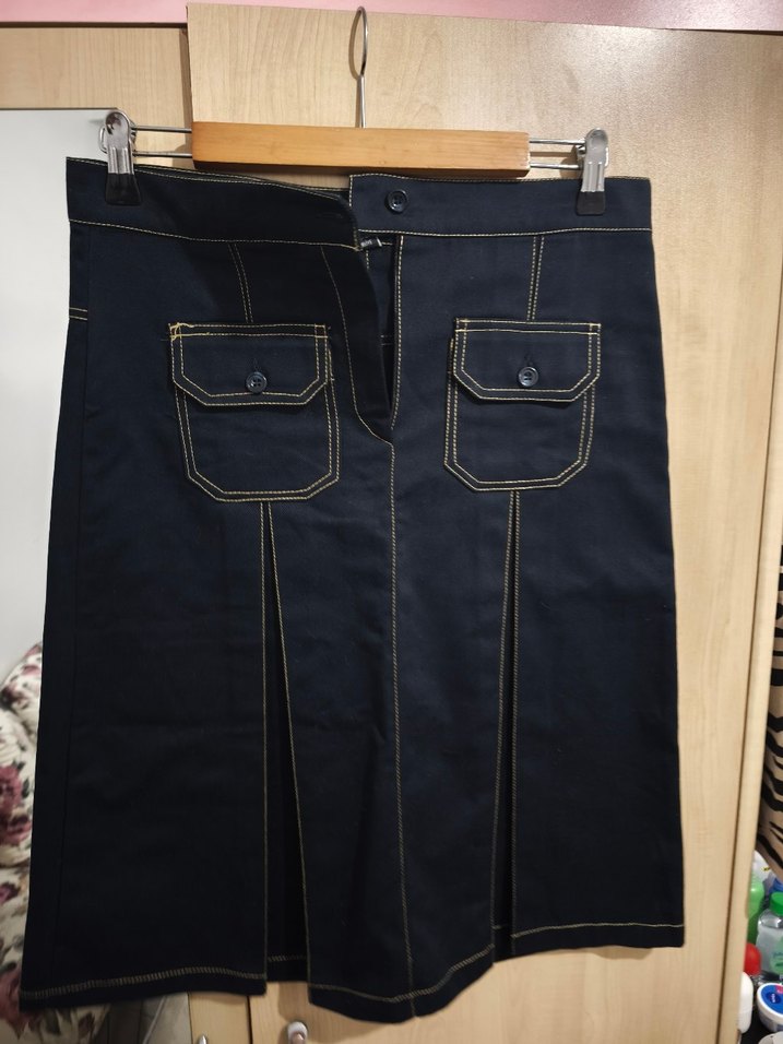 Siyah kot kumaştan, bel kemerli ve cepli midi hamile eteği. Rahat kesimi ve sokak tarzı ile ofise uygun.