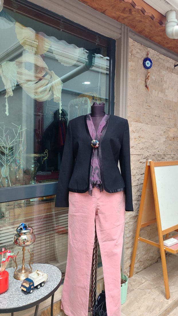 vintage,yaka, kol ve etek kenarları saten detaylı siyah yün ceket. kol uzunluğu 63 cm. , sırtından boyu 58 cm. dir. önünde iliklemek için iki tane iplik örme eklenmiş ama dugmesi yoktur. broşu takarken kumaş zedelenmesin diye konulmuş olabilir bilemedim. az kullanılmış ve orjinaldir. dolabimizdaki tüm ürünler orjinaldir.