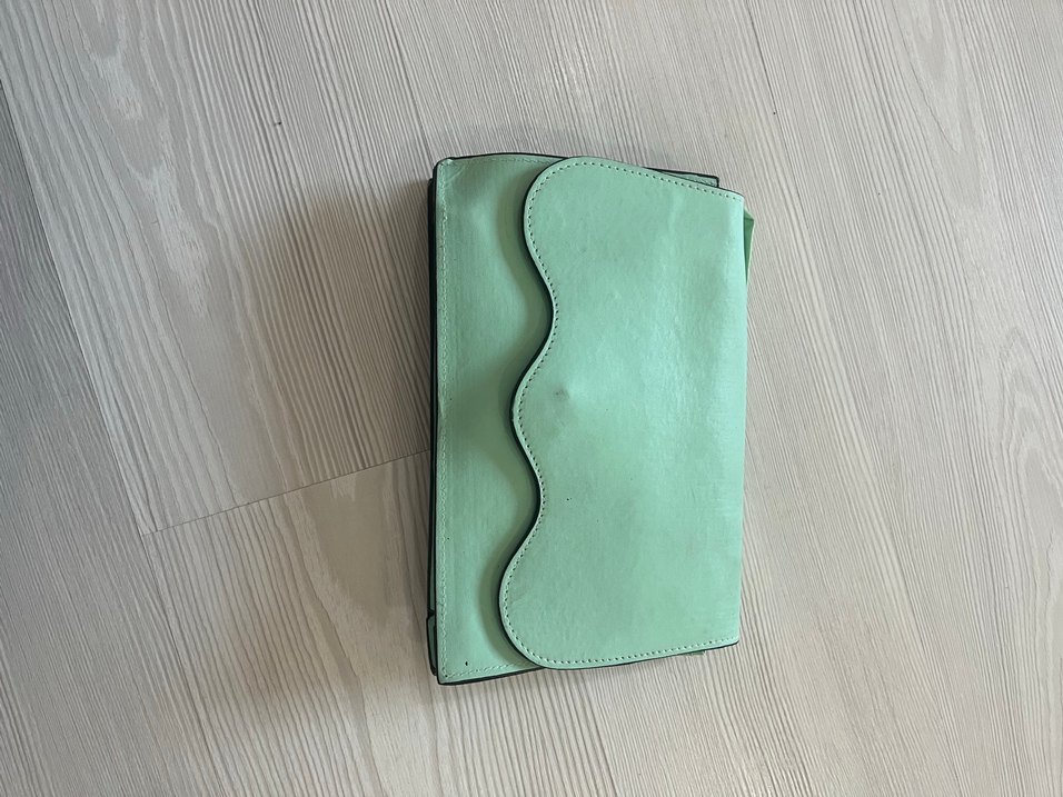 Pastel yeşil deri clutch, vintage stilde ve tokalı kapaklıdır. Minimalist ve desensiz tasarımıyla günlük kullanıma uygundur.