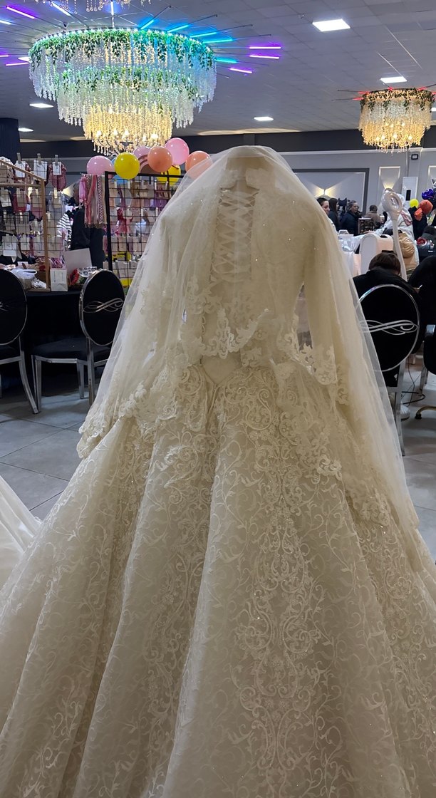 Uzun ve vücuda oturan prenses gelinlik, straplez yakalı ve ince askılıdır. Vintage tarzda, detaylı dantel işlemeli ve açık beyaz renklidir, klasik şıklık için uygundur. 36 40 bedene kadar uygun