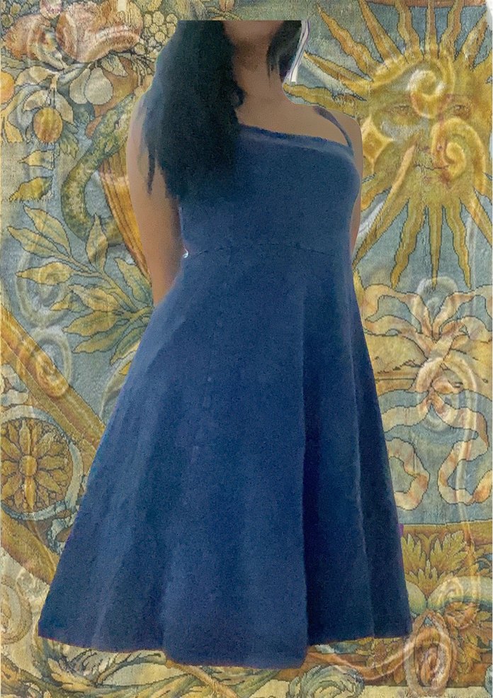 Lacivert midi elbise, straplez kesim, drapeli ve ince askılı, bohem tarzıyla düğünler için uygun.