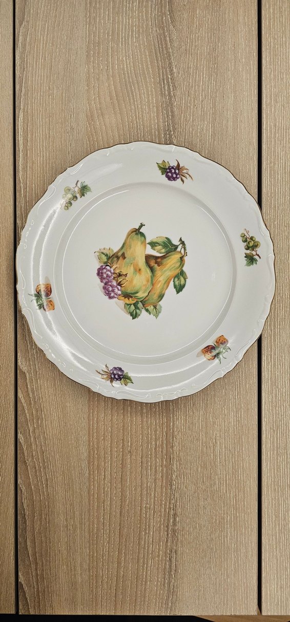 Damgalı ve Çekoslavak porselendir. Çapı 23,5 cm. Sağlam ve kusuru yok. Meyve desenli, beyaz seramik tabak, dalgalı kenarlarıyla klasik bir sunum sağlar. ️