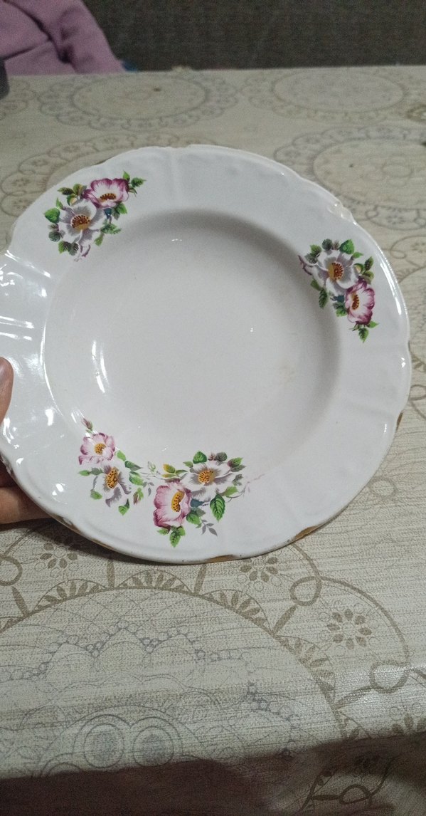 Çiçek desenli beyaz seramik tabak, açık mor ve yeşil detaylara sahiptir. Pürüzsüz yüzeyli ve klasik tasarımlıdır. ️