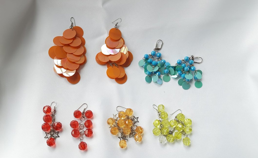 Renkli cam boncuklar ve puantiyeli desenlerle süslenmiş, bohem tarzda küpeler.