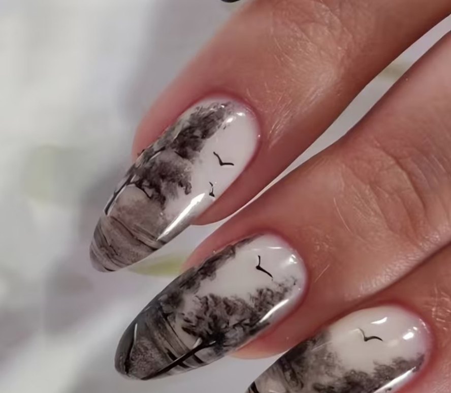 24 lu vintage badem Takma tirnak. Doğal görünümlü ağaç ve kuş desenli gri tırnak süslemeleri.