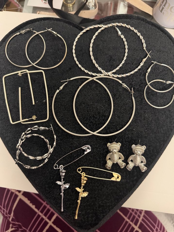 Altın renginde, tokalı kapanışlı vintage tarzda küpeler. Halka, ayıcık ve emniyet iğnesi tasarımları içerir, romantik akşamlar için uygun. ✨