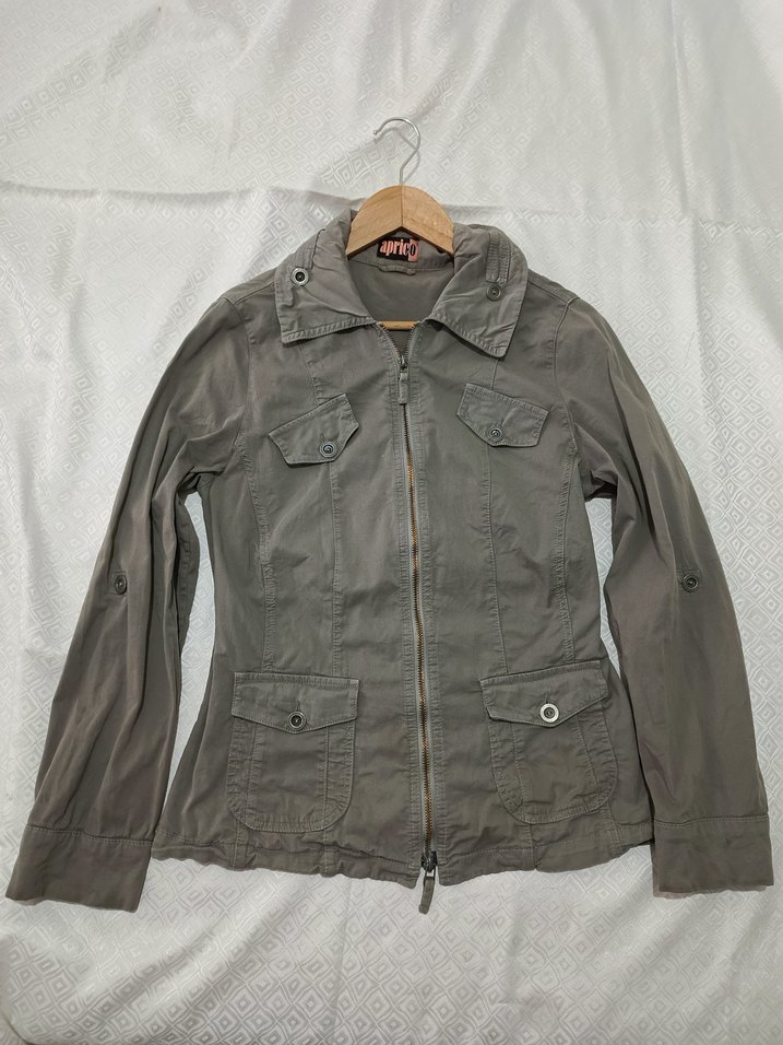 Haki renkli, uzun kollu ve kesimli, fermuarlı kadın ceket. Çoklu düğmeli cepler detaylar içerir, günlük kullanıma uygundur.