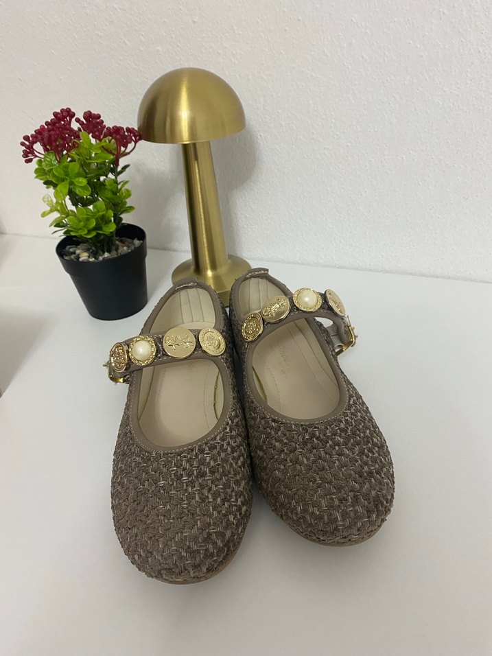 Kahverengi örgü babetler, vintage tarz tokalı kayış ve çiçek desenine sahiptir. Gri tonlarıyla klasik zarafeti günlük kullanıma taşır.