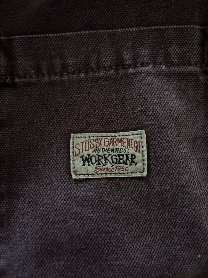 Koyu kahverengi, vintage tarzı erkek rozeti, 'WORKGEAR Authentic Since 1980' yazılı dokulu kumaş üzerinde. Trendy casual sokak giyimine uygun. ️