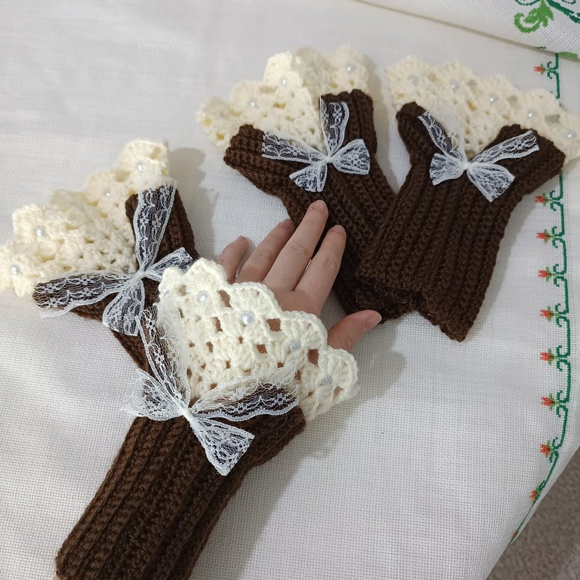 Yumuşak örgüden yapılmış, beyaz dantel ve inci detaylı, vintage tarzı renkli kadın eldiveni.