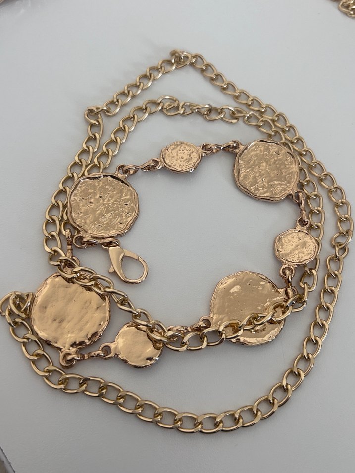 Uzun altın renk zincir kolye, dokulu yuvarlak parçalar ve parlak yüzeyle vintage bohem tarzını yansıtır. ✨