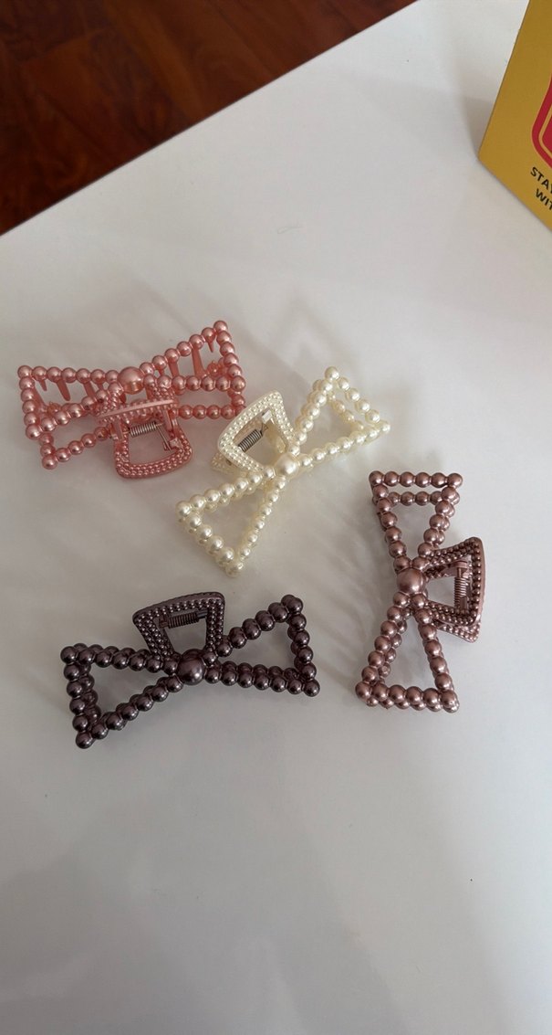 Bu set, hafif ve çok renkli plastik boncuklardan yapılmış dört vintage tarzı fiyonk saç tokası içerir. Her toka, inci görünümlü bohem tasarıma sahiptir. Toplu 4 adet