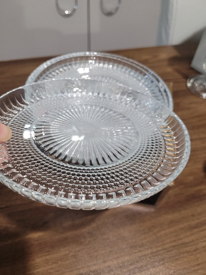Vintage tarzı şeffaf cam tabak, dokulu tasarıma sahip. Açık ve desensiz görünümüyle servis veya sunum için uygun. ️