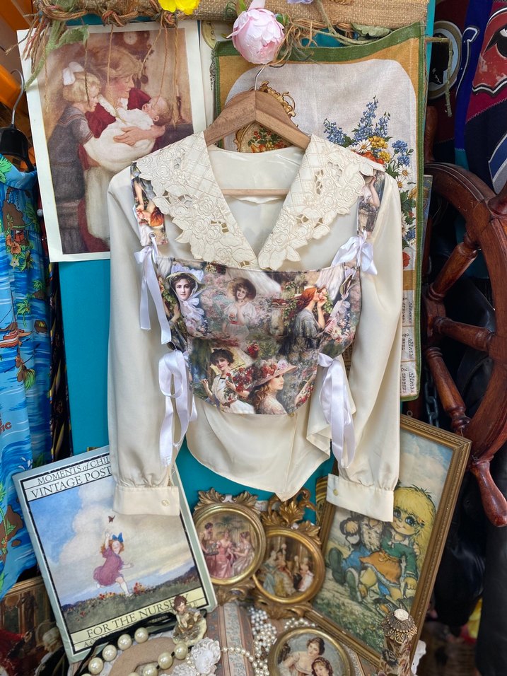 Boy 44 / En 44 Tasarım Korse/Beyaz kumaş üzerine pastel baskılı, kısa ve vücuda oturan hemşire korsesi. Dantel detaylarıyla süslenmiştir.