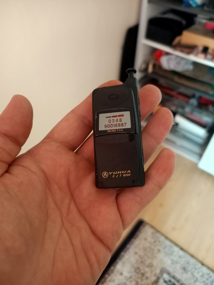 Küçük ekranında numaralar bulunan siyah Yuhua mini telefon, basit tasarımlı ve antenli.