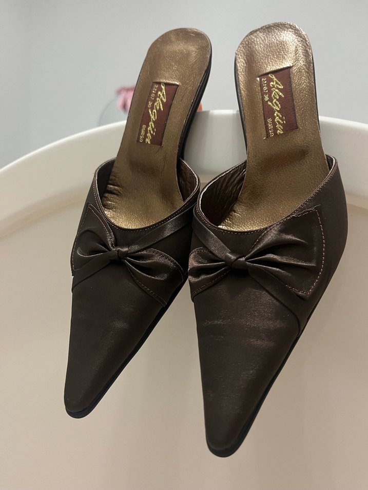 Kahverengi saten kadın stiletto topuklu terlik fiyonk detaylı ve sivri burunlu. Ofis için klasik Paris tarzında, numarası 37 ama bence 36 numaraya daha iyi olur kalıbı biraz dar hiç kullanılmadı