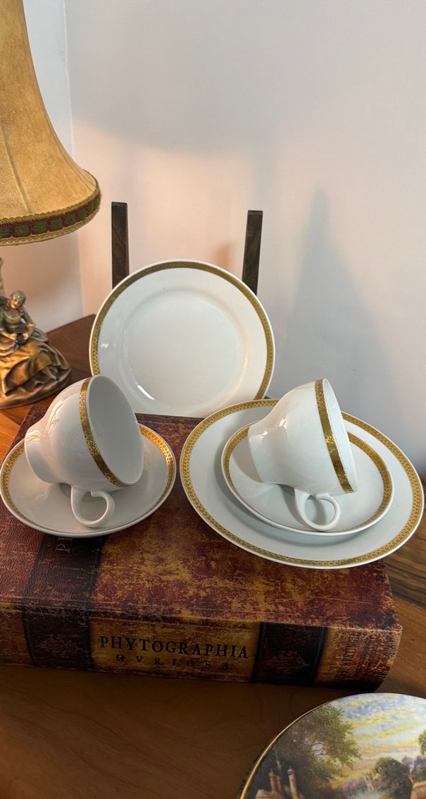 Altın yaldızlı beyaz porselen fincan, tabak ve küçük tabaklardan oluşan şık ve klasik bir set. "Kahla" damgalı☕
