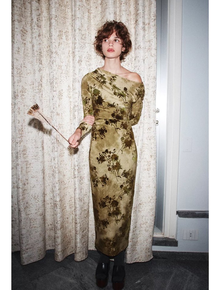 Vintage tarzda, uzun, vücuda oturan, drapeli ve straplez yakalı elbise. Parlak haki renkte, ipeksi kumaş ve batik desenli, parti için uygun.