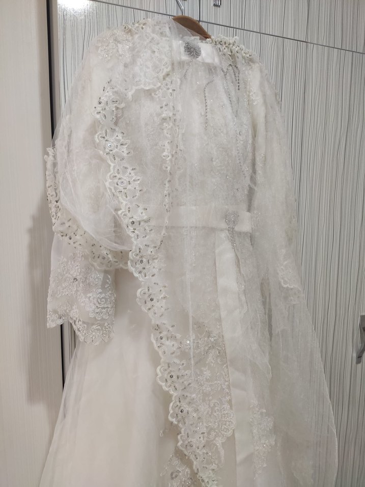 Vintage tarzda, tekne yaka ve uzun kollu, bol kesim beyaz renkli, uzun boy A kesim gelinlik. Klasik zarafet için uygundur.